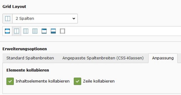 Spalten können durch hinzufügen eines Inhaltselementes erstellt werden. Im Inhaltselementdialog kann die gewünschte Anzahl an Spalten im Tab "Grid Elements" ausgewählt und im folgenden Dialog die Breite der einzelnen Spalten angepasst werden. Weitergehende Anpassungen der einzelnen Spaltenbreiten werden im Register "Angepasste Spaltenbreiten" vorgenommen. Siehe auch "Bootstrap Grid options".